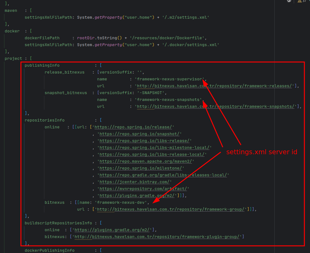 - settings.xml dosyası {user-home}/.docker/settings.xml altına kopyalanmalıdır ve docker repository'sine(ör. Harbor) erişim için gerekli bilgiler dosya içerisine eklenmelidir.