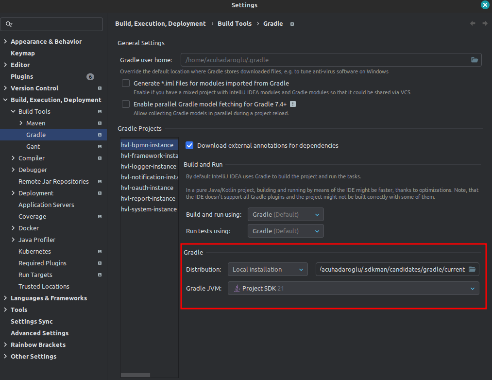 - Gradle uyumsuzlukları olmaması için indirilen gradle 8.10 versiyonu ideaya gösterilmelidir ve gradle JVM project SDK seçilmelidir.